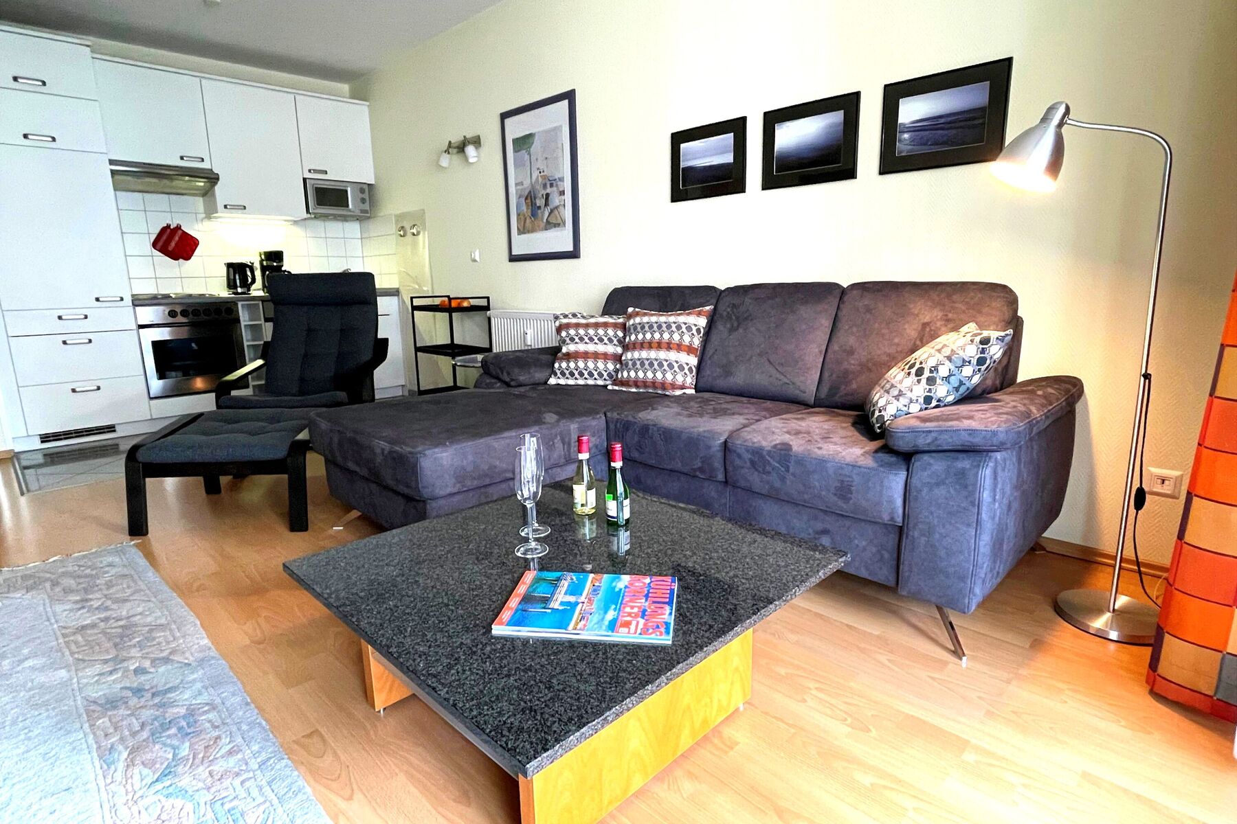 Die moderne, großzügig geschnittene 3-Zimmer-Fewo befindet sich im 1. Obergeschoss, ist ca. 61 m² groß und für bis zu 4 Personen eingerichtet.