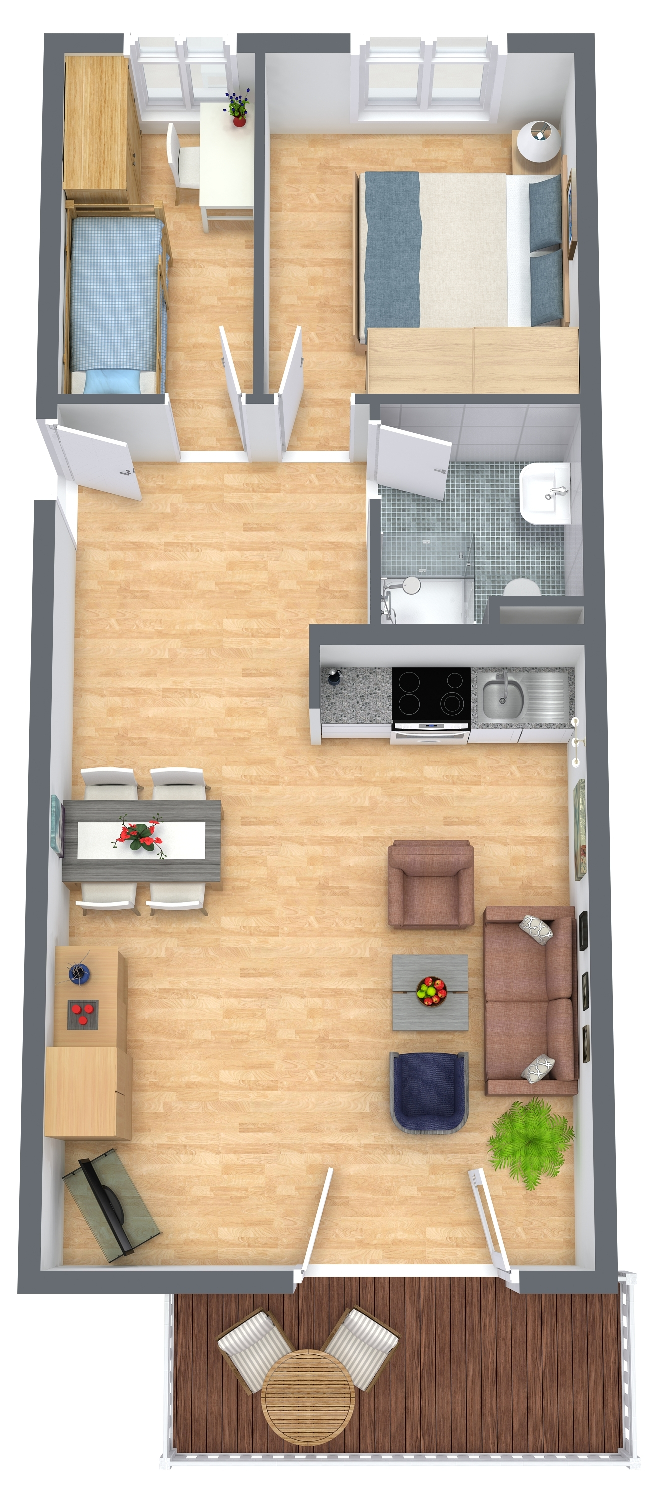 Im großen Schlafzimmer finden Sie ein Doppelbett. Das 2. Schlafzimmer ist mit einem Etagenbett ausgestattet.