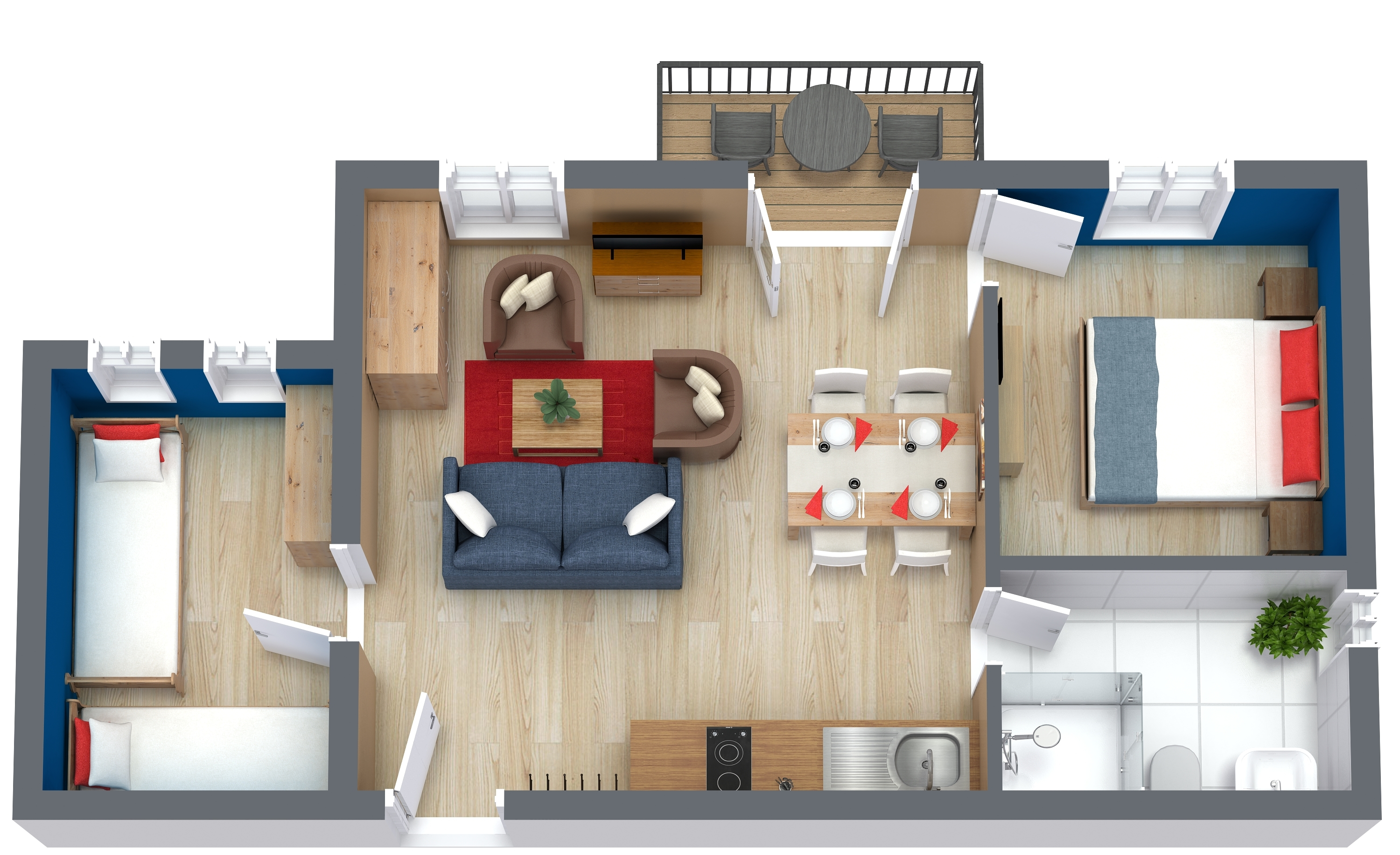 Der Wohnbereich bietet Ihnen Platz für bis zu 4 Personen und verfügt über einen Zweisitzer, zwei Cocktailsessel und den angrenzenden Essbereich.