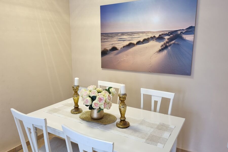 Das offene Wohnzimmer lädt zum Entspannen ein und bietet Platz für ein ausgiebiges Frühstück im angrenzenden Essbereich.