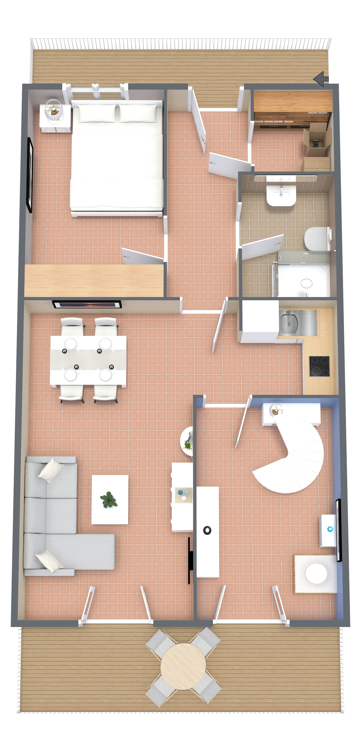 Die Wohnung besteht aus einem Schlafzimmer mit Doppelbett und einem Durchgangsraum, der als zweites Schlafzimmer mit einem Schrankbett genutzt werden kann.