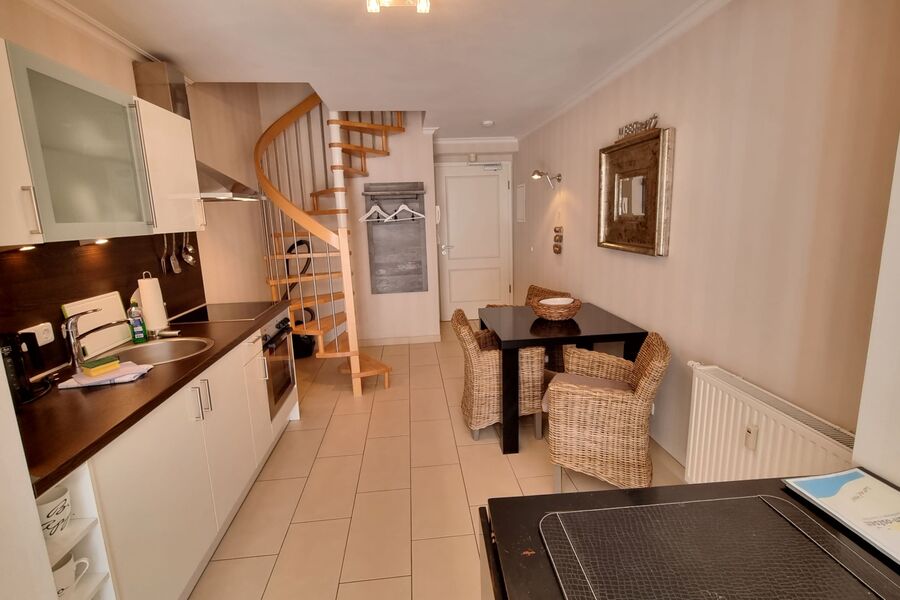 Der Wohnbereich im EG bietet eine Sitzgruppe, eine Einbauküche mit Backofen und 4-Platten-Ceranfeld. Zur technischen Ausstattung gehören ein Flachbild-TV und eine HiFi-Anlage.