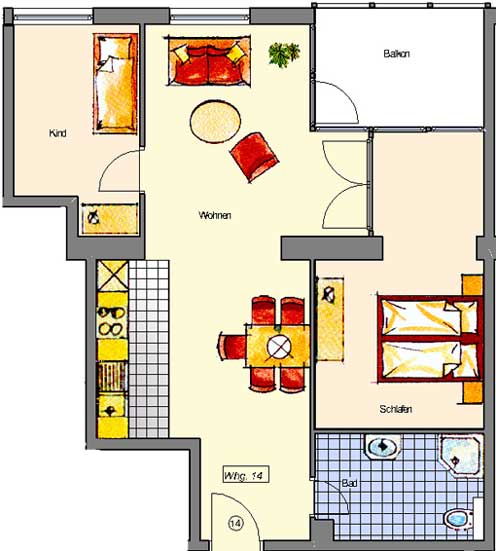 Die Ferienwohnung Nr. 14 ist ca. 63 m² groß. Hier können 2-4 Personen einen erholsamen Aufenthalt verbringen. Der Südbalkon lädt zum Verweilen ein.