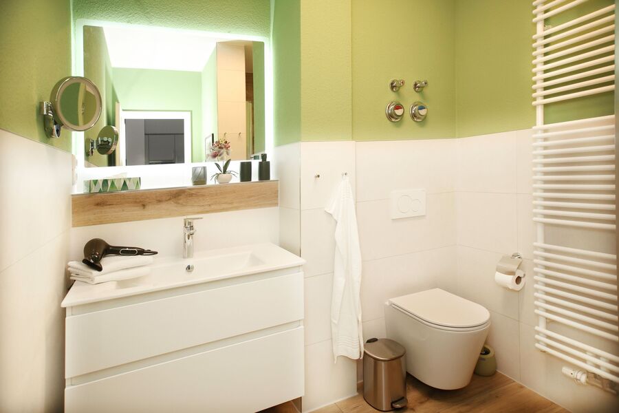 Das Anfang 2026 komplett sanierte Duschbad/WC ist gefliest und mit Fußbodenheizung ausgestattet.