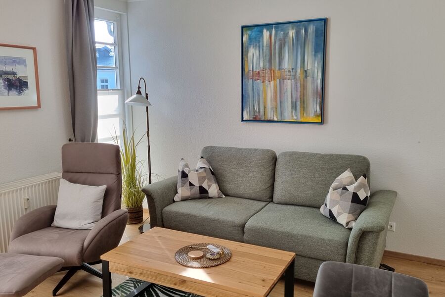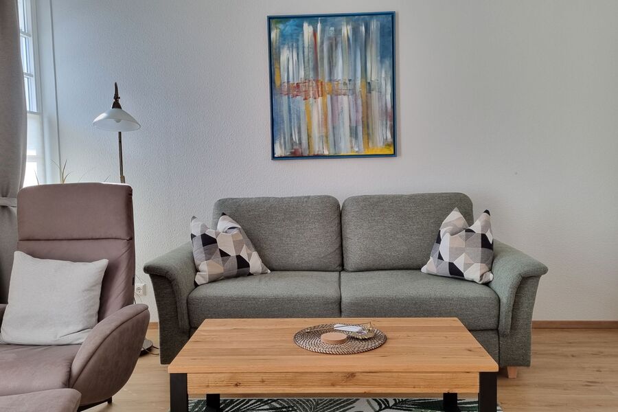 Der geräumige Wohnbereich verfügt über eine Sitzgruppe.