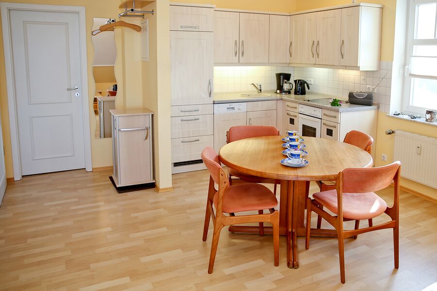 Die Wohnung ist auf ca. 45 m² eingerichtet mit einem Wohnzimmer mit Schlafcouch, Esstisch und Pantryküche mit Backofen, Herd und Geschirrspüler.