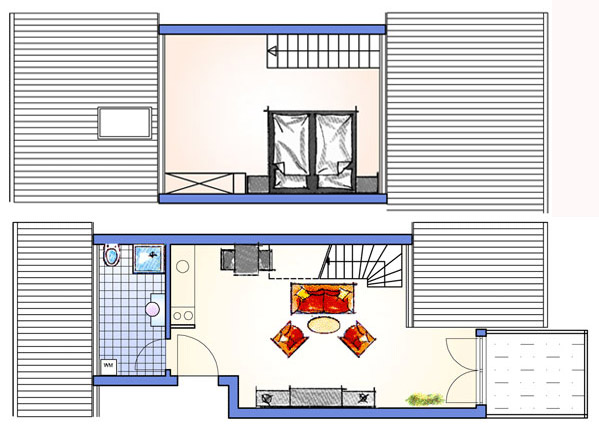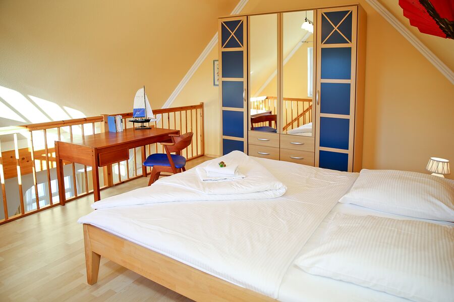 Galerie mit einem Doppelbett. Im Bad/WC ist eine Dusche.