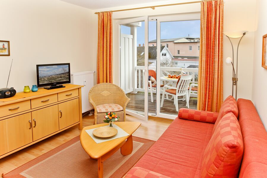 Die gemütliche Ferienwohnung liegt im 1. Obergeschoss des Hauses. Der Wohnbereich bietet eine Sitzgruppe mit Doppelschlafcouch, Farb-TV und Radio.
