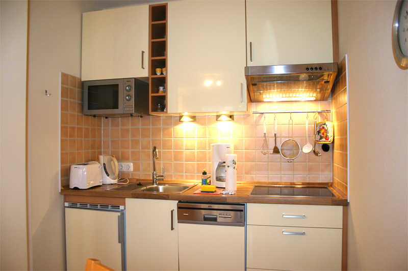 Die Einbauküche m. Mikrowelle u. Geschirrspüler ist im Wohnbereich integriert. Das Schlafzimmer ist ausgestattet mit einem Doppelbett.