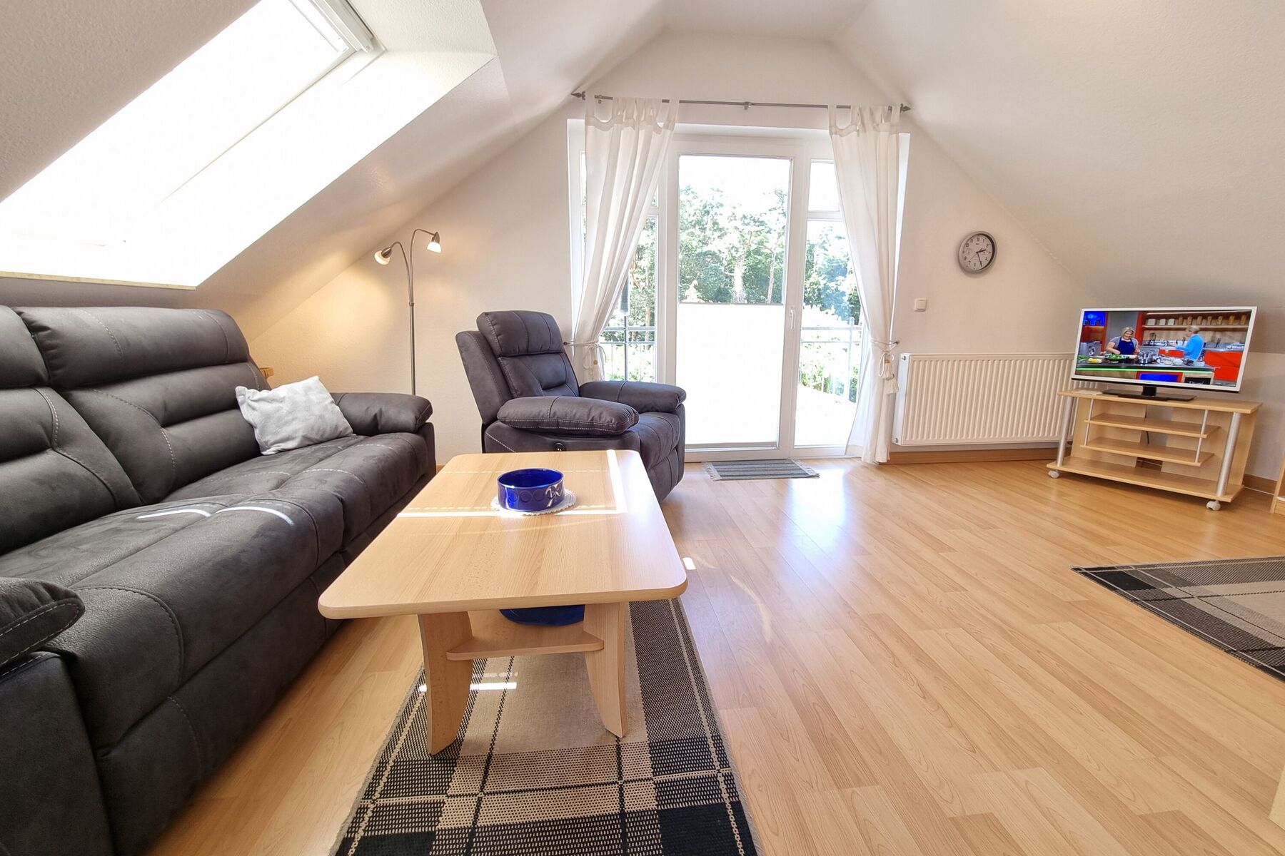 Zur technischen Ausstattung gehören Radio mit Kassette + Farb-TV. Der Balkon lädt Sie zum Verweilen ein. Die Wohnung verfügt über einige Dachschrägen.