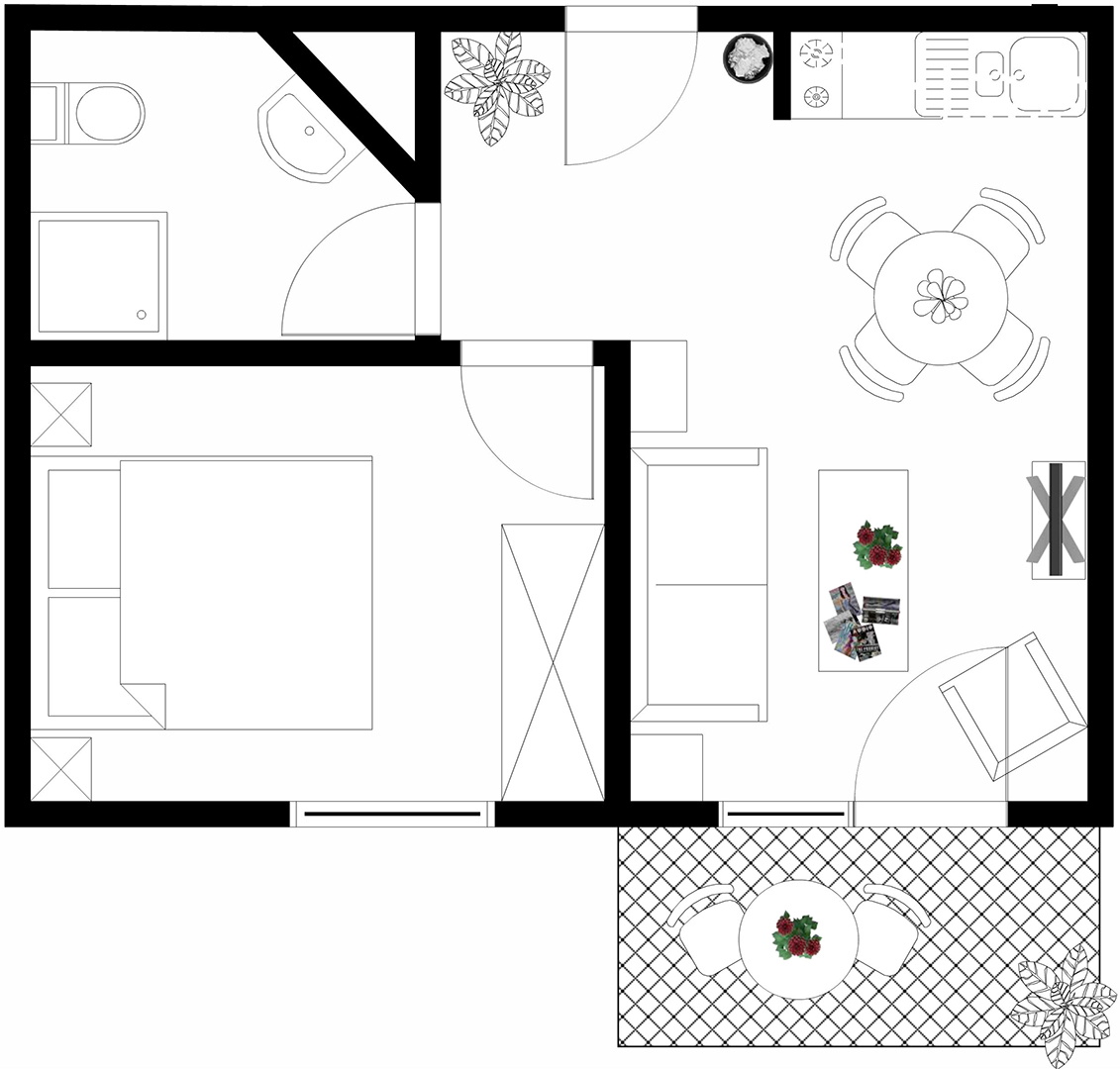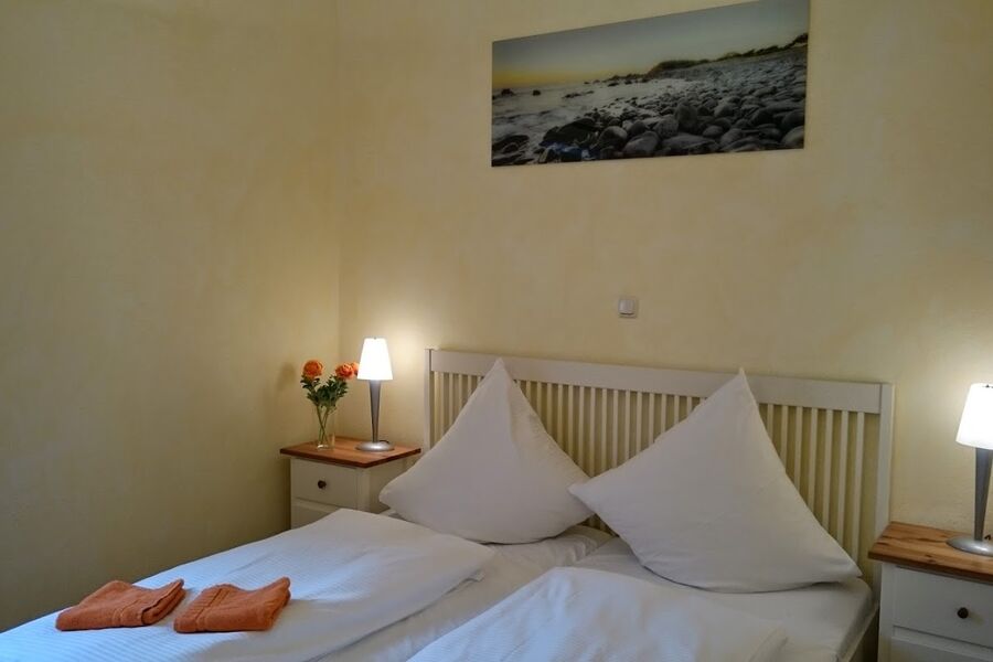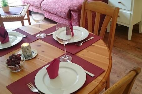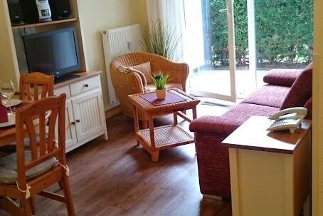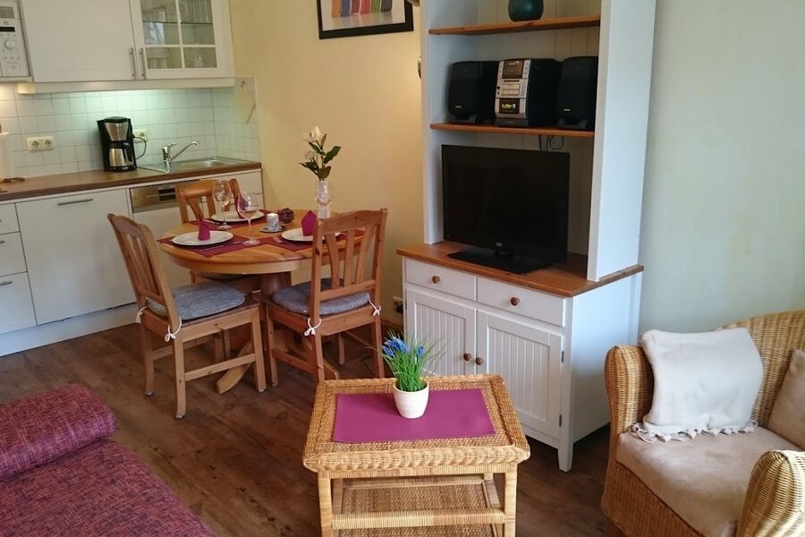 Der Wohnbereich ist mit Sitzgruppe und einem Esstisch eingerichtet. Im Wohnbereich ist eine Pantryküche mit Mikrowelle und Gespirrspüler integriert. Ein Bad/WC mit Dusche ergänzt die Ferienwohnung.