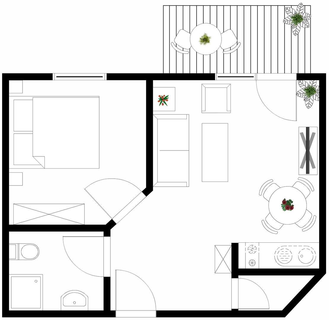 Im Wohnbereich ist eine Pantryküche mit Mikrowelle integriert. Ein Bad/WC mit Dusche ergänzt die Ferienwohnung.