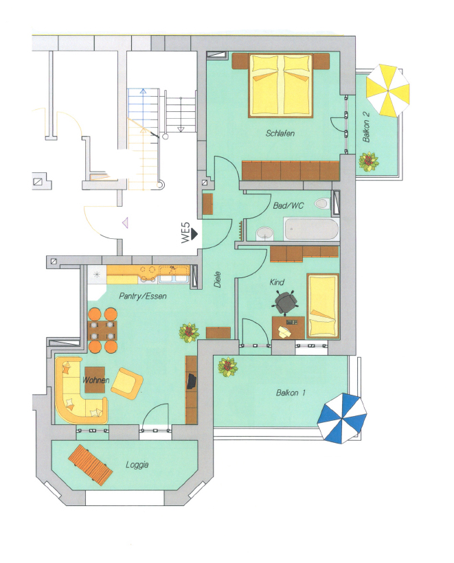 Die Wohnung liegt im 1.OG des Hauses mit einer Loggia sowie einem Balkon zur Nordseite und einem Balkon zur Westseite. Sie bietet für 4 Personen ein Schlafzimmer mit Doppelbett und ein Schlafzimmer (durch einen Raumteiler vom Wohnbereich getrennt) mit Einzelbett sowie einem Schlafsessel.